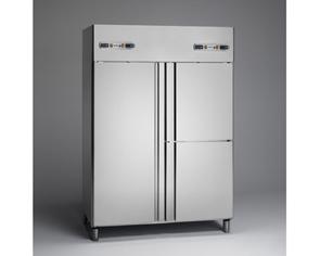 2+1 ajtós, kétlégterű rozsdamentes hűtőszekrény. Automata ajtóbehúzás. Belső világítás. Felszerelés: 3 db műanyaggal burkolt acél polcok GN 2/1, állítható magassággal, és 3 pár vezetősínnel GN 2/1 részére. 60 mm-es poliuretán szigetelés. Térfogatsúly: 40 kg/m3, CFC mentes. Eltávolítható, hűtött, légmentesen zárt kompresszor. Ventillációs hűtés. Hűtőközeg: R 134 A CFC mentes. Réz evaporátor, alumínium bordázattal. Automata vízelpárologtatás a leolvasztás ideje alatt. Elektronikus hőmérséklet és leolvasztás vezérlés, kijelzés. Hűtéstartomány: -2 °C / +8 °C Környezeti hőmérséklet: max. + 38 °C. Elektromos bekötés 230 V - 1N - 50/60 Hz.